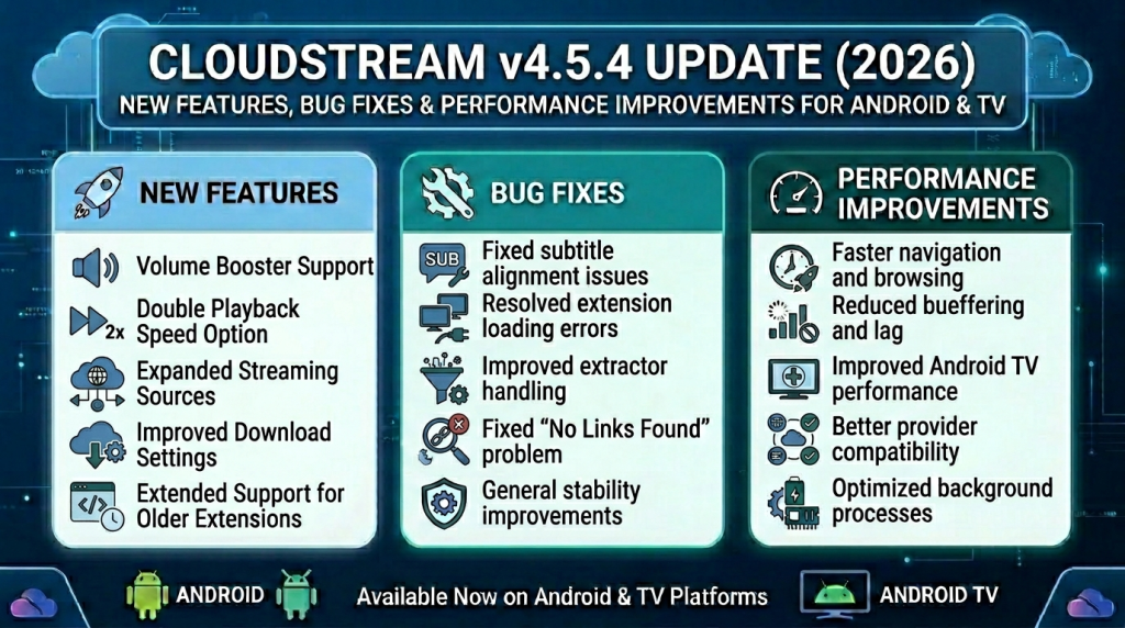 CloudStream v4.5.4 introduces performance improvements, updated extractors, better extension compatibility, subtitle fixes, volume booster support, and improved playback stability. The update focuses mainly on reducing errors and improving streaming reliability.